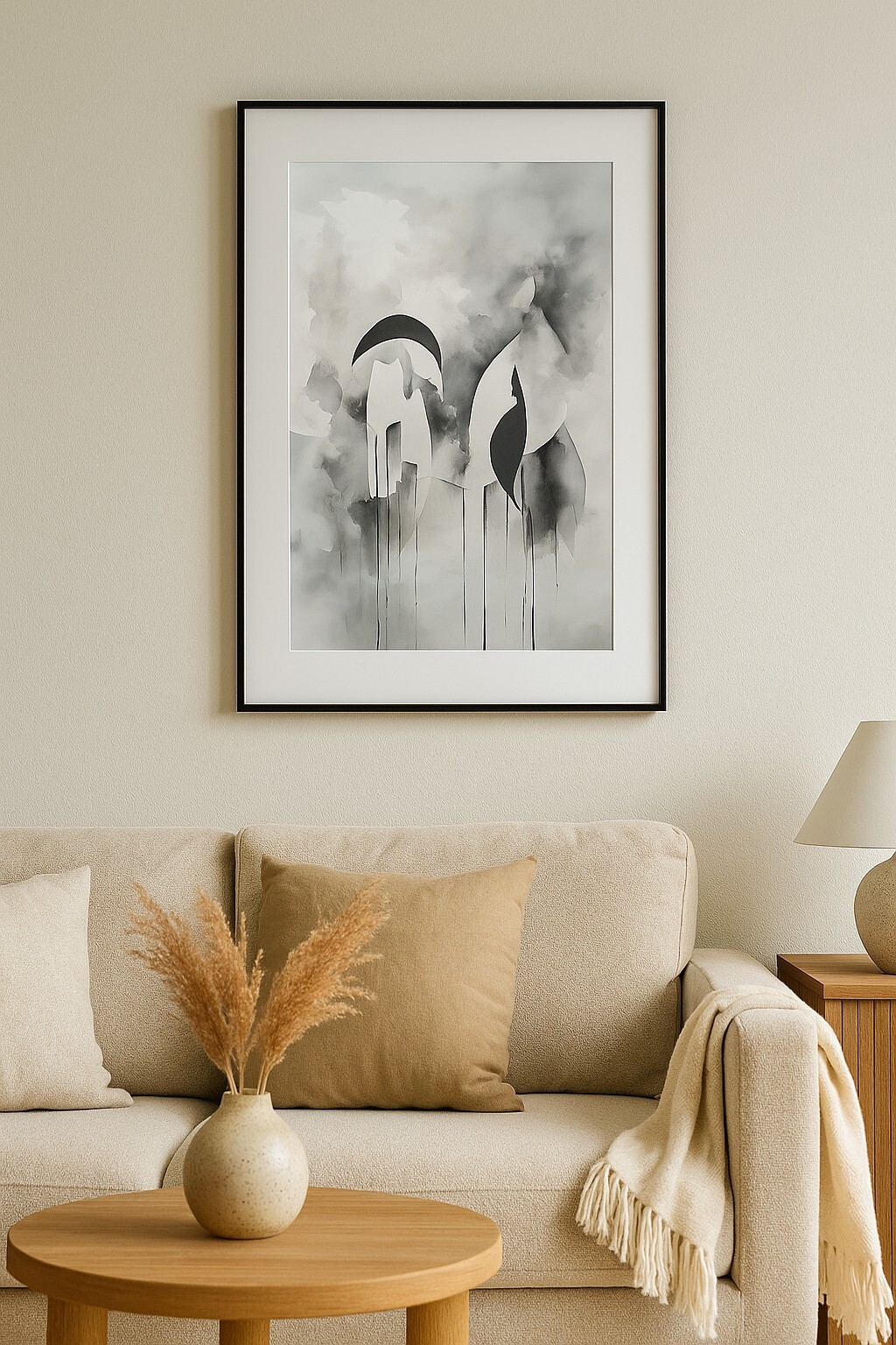 Ten nowoczesny plakat dekoracyjny w stylu minimalistycznym łączy odcienie szarości, czerni i bieli, tworząc subtelną, nastrojową kompozycję. Idealny do salonu, sypialni czy biura – wprowadza elegancję, spokój i artystyczny charakter. Plakat świetnie wpisuje się w aktualne trendy wnętrzarskie i stanowi doskonałe uzupełnienie galerii ściennej w stylu skandynawskim, nowoczesnym lub japandi.