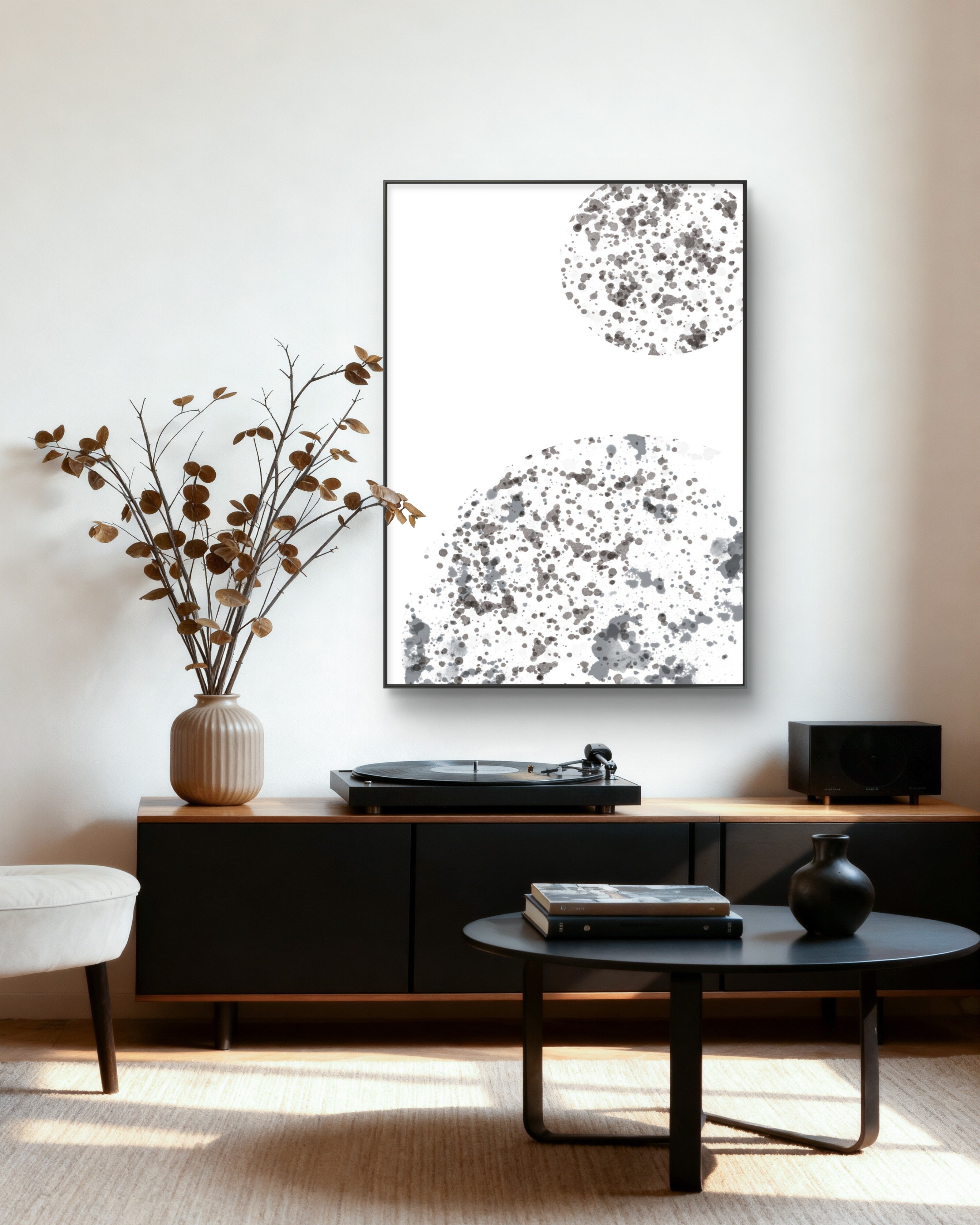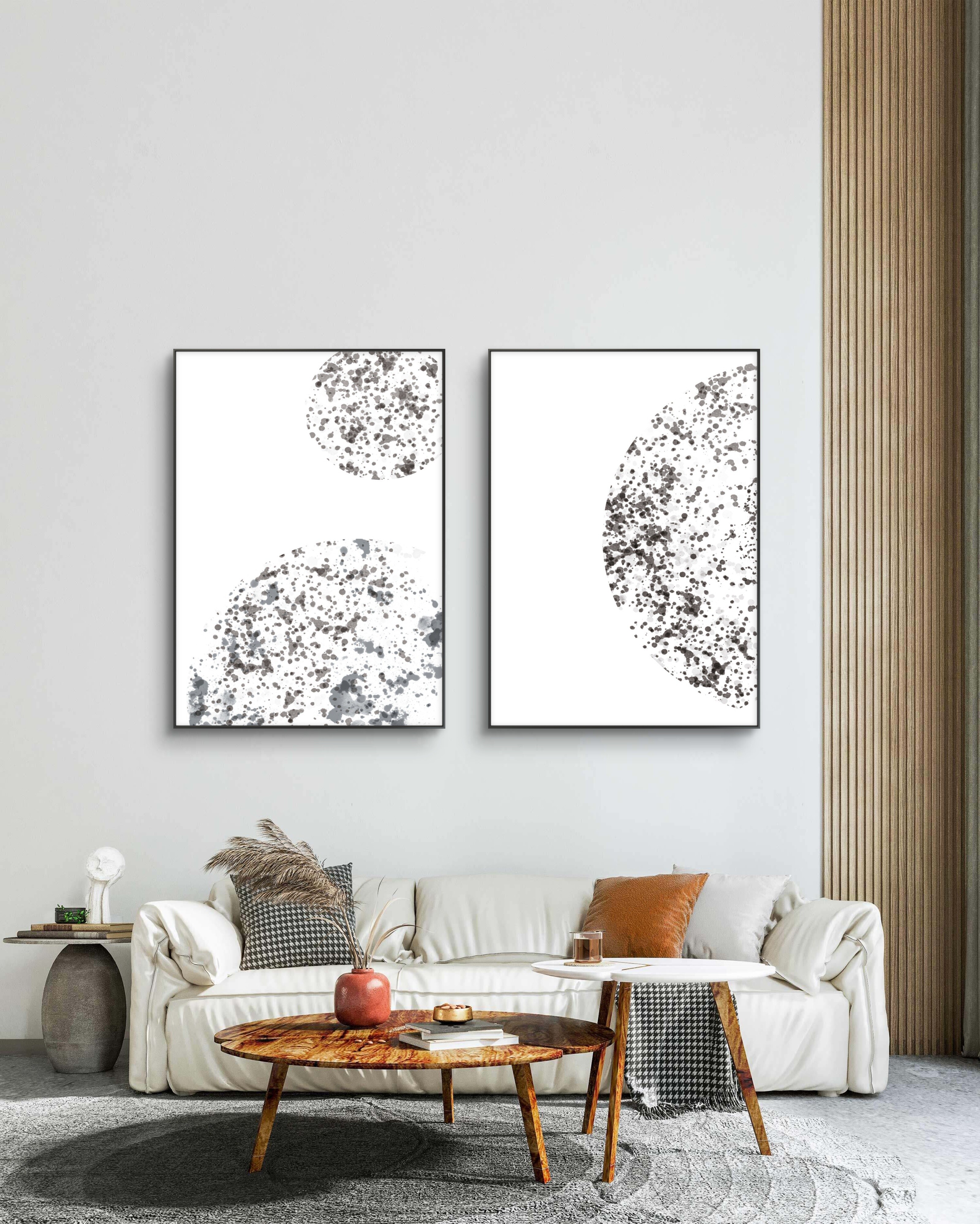 Plakat „Echo przestrzeni” to minimalistyczna kompozycja inspirowana rytmem natury i miękkimi kontrastami tuszu. Czarno-szare plamy układają się w harmonijny, dynamiczny wzór, który wprowadza do wnętrza spokój i wyważony ruch. Idealny do stylu japandi, modern classic i minimalistycznego. Kolekcja Monochrome Flow – rytm form i światła to zestaw plakatów inspirowanych abstrakcyjną ekspresją i harmonią natury. Subtelne, czarno-białe kompozycje.