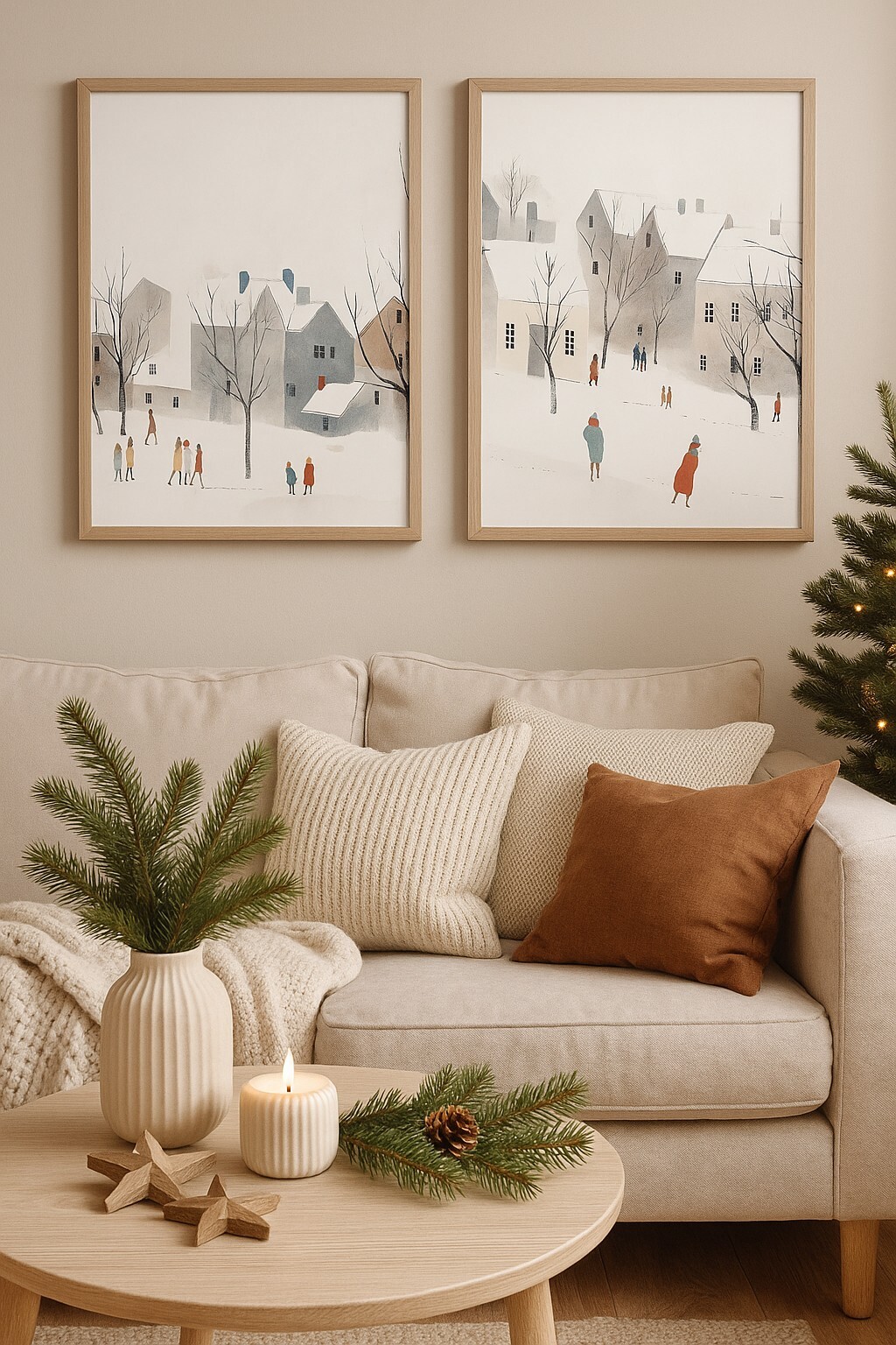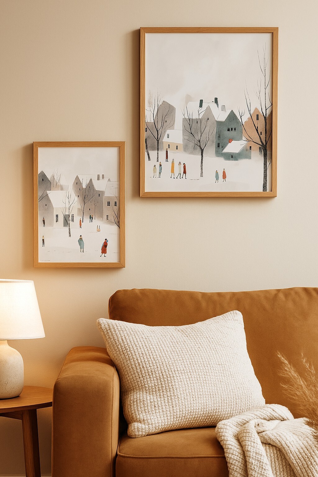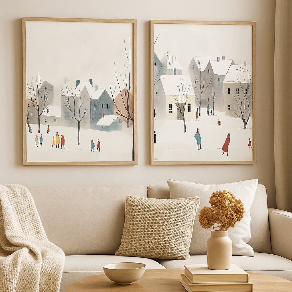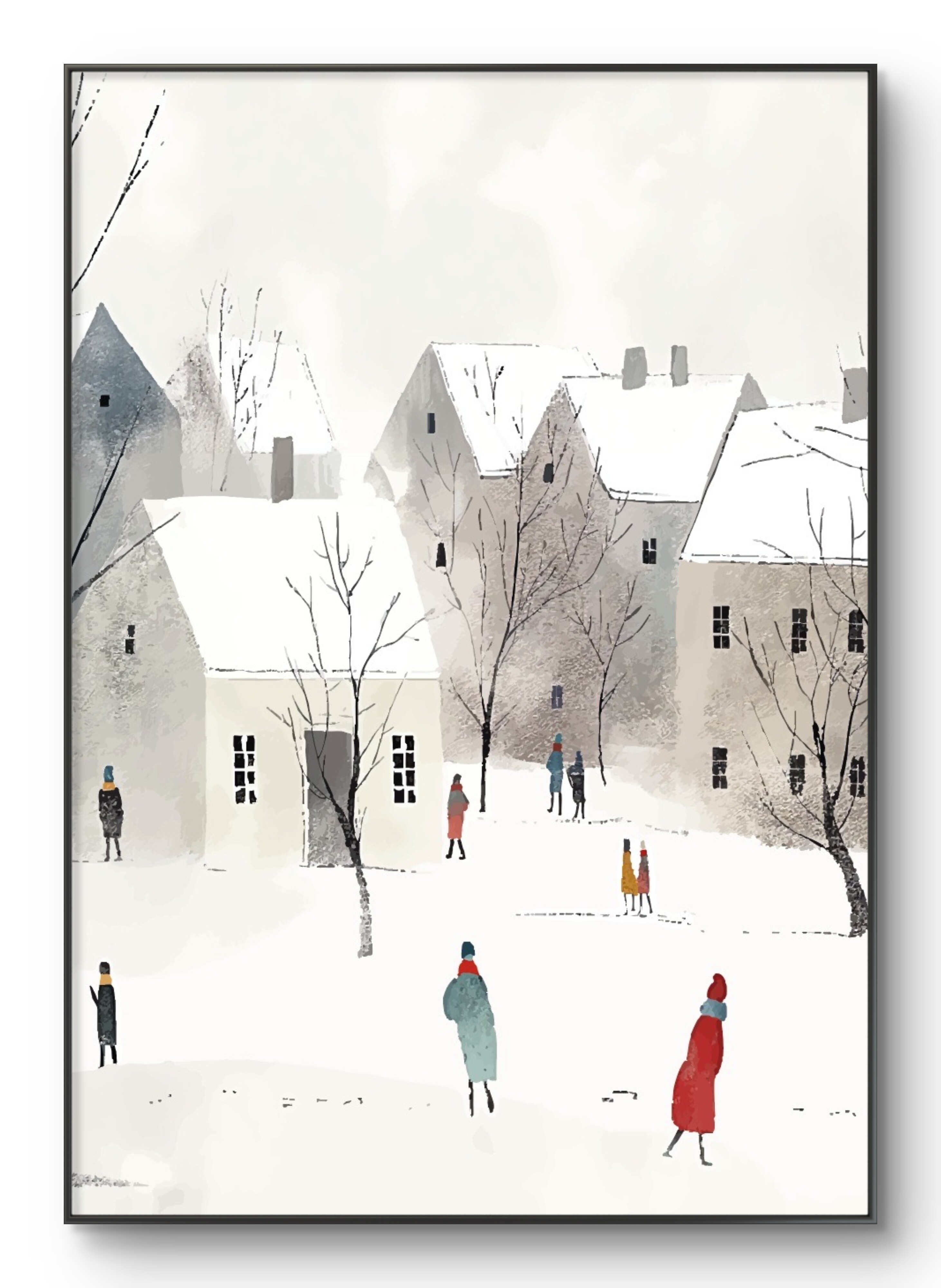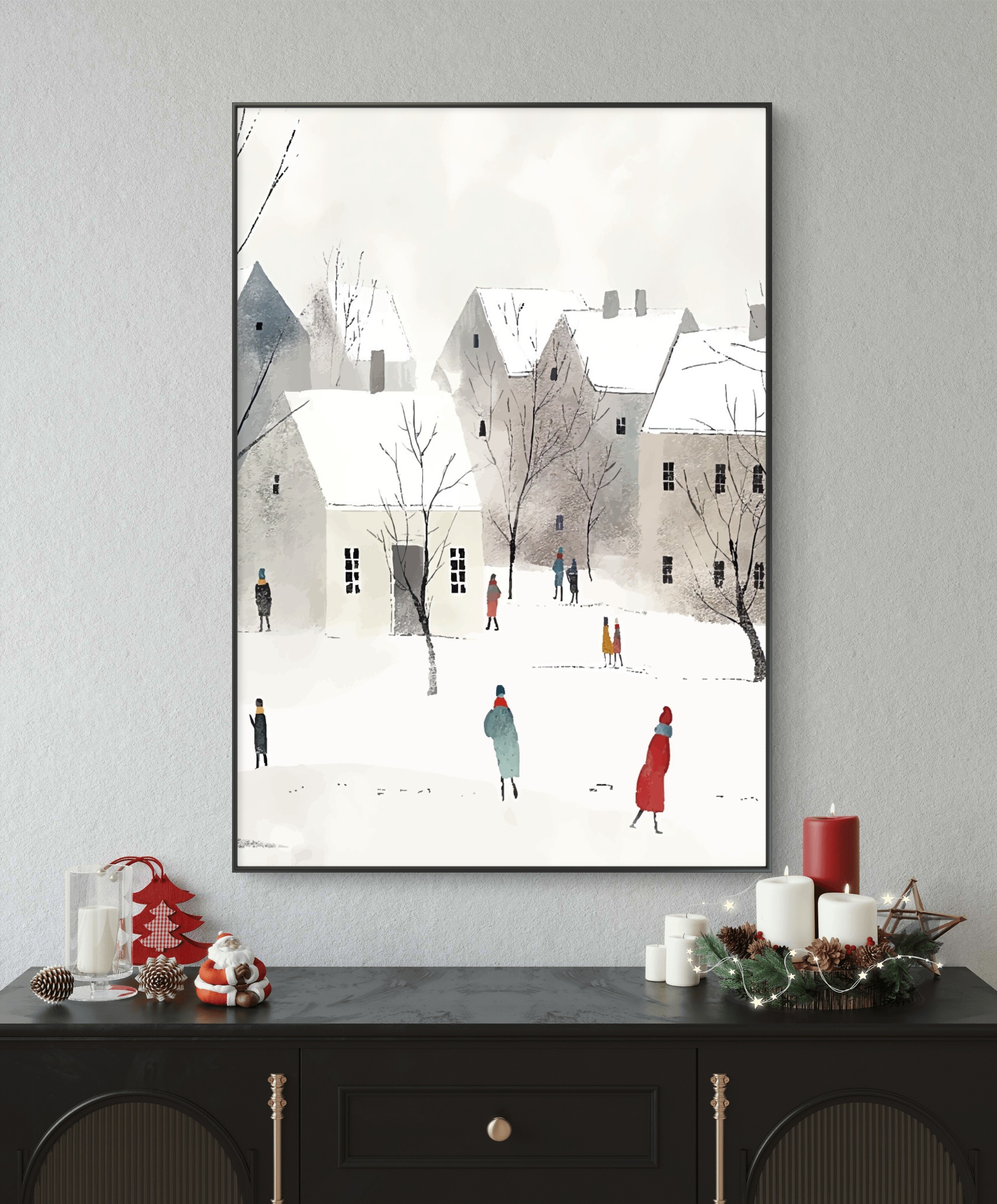 Uroczy plakat w stylu akwareli przedstawiający świąteczne domki pokryte śniegiem i spacerujących ludzi, tworzy sielski, zimowy klimat. Jasna, subtelna kolorystyka sprzyja relaksowi i przytulności. Doskonale komponuje się z wnętrzami w stylu hygge, minimalistycznym i boho.