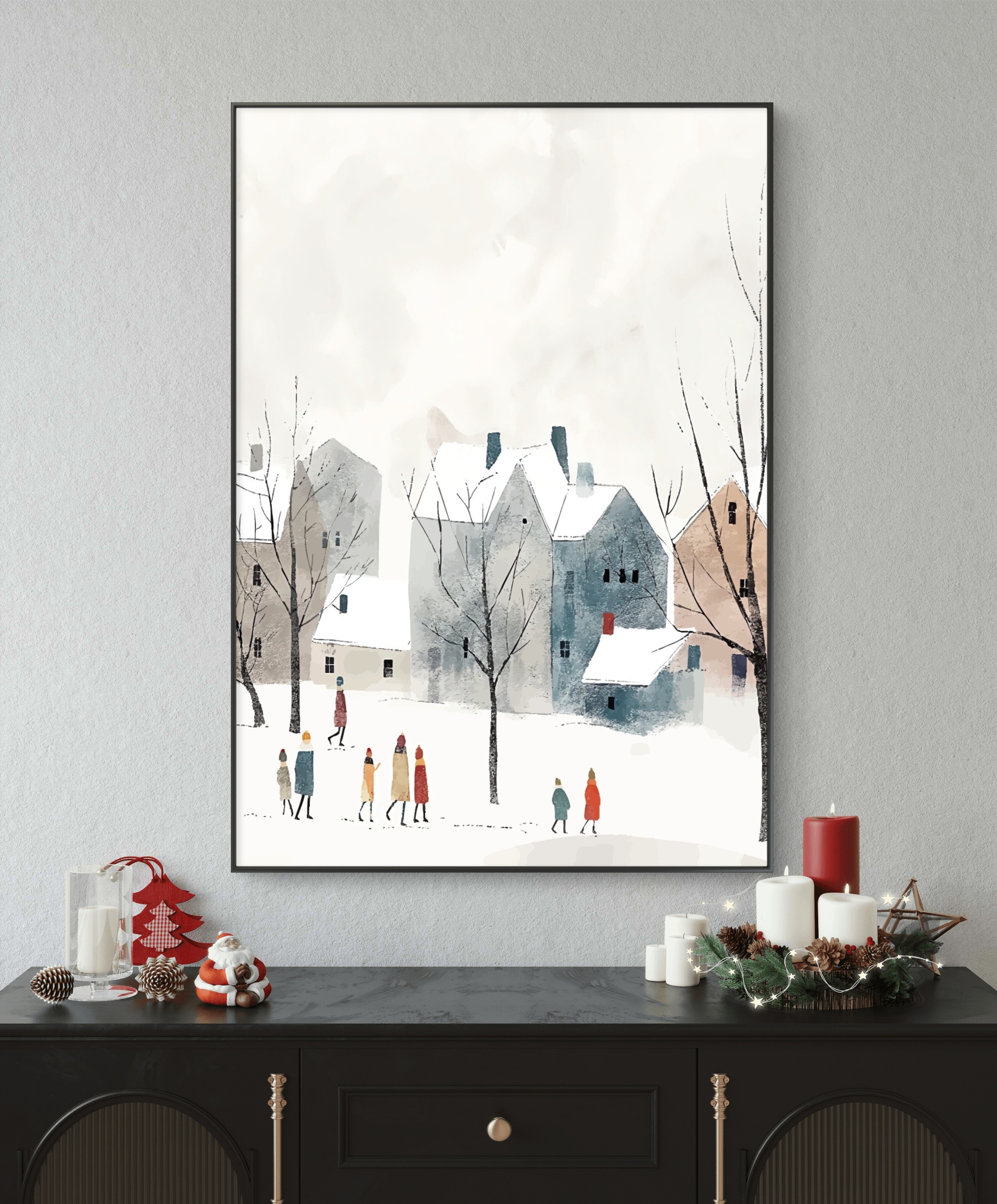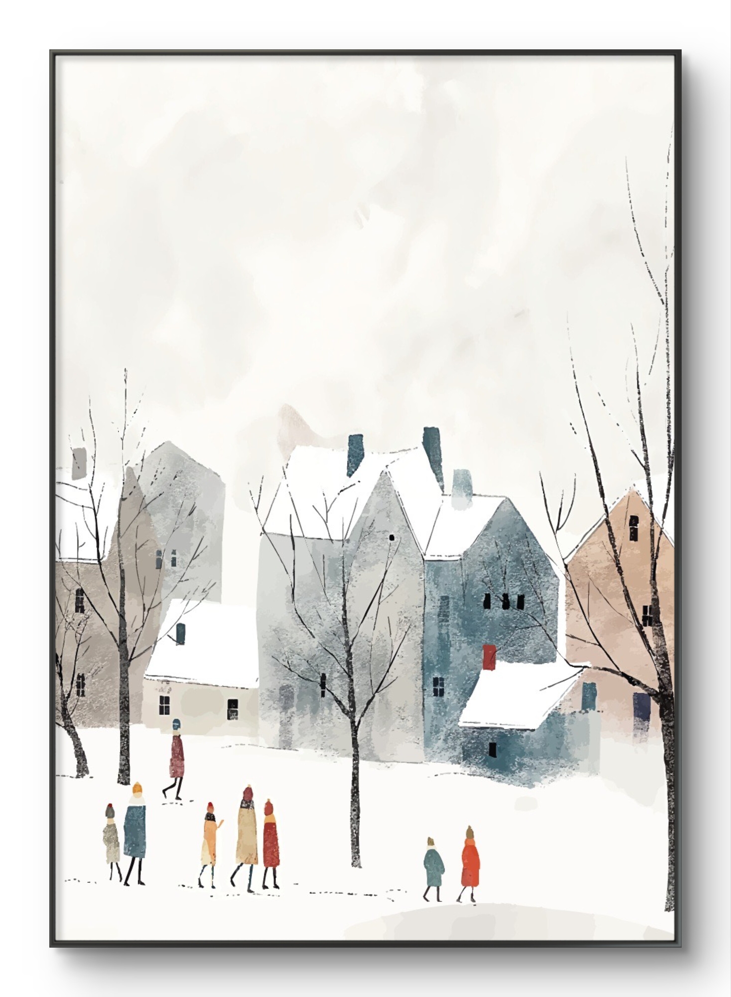 Ten plakat zimowy w stylu akwareli przedstawia urokliwe świąteczne miasteczko, w którym ludzie spacerują po zaśnieżonych uliczkach. Stonowana kolorystyka – odcienie bieli, szarości i subtelnych czerwieni – wprowadza spokój i świąteczny nastrój. Idealny do przytulnych wnętrz w stylu skandynawskim, rustykalnym i klasycznym.